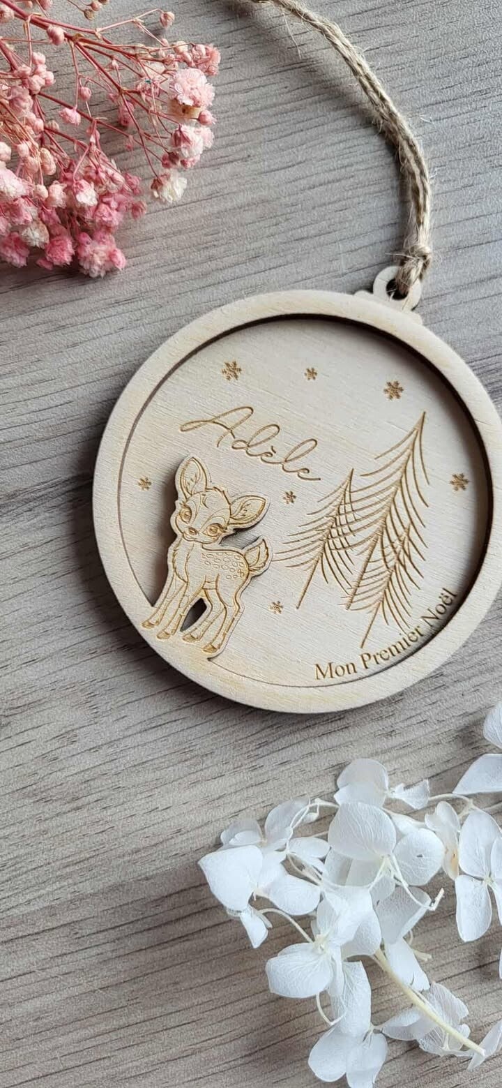 Dans notre nouvelle collection retrouvez notre biche dans une tout autre version gravée, une boule remplie de Légèreté et de douceur entièrement en bois clair avec son petite biche