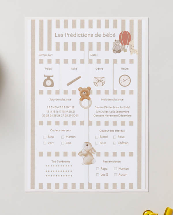 Prêt à parier sur l'arrivée de bébé ? Donnez du peps à votre fête prénatale avec nos cartes de prédictions à imprimer. Un moment fun, convivial et un superbe souvenir pour la future maman !